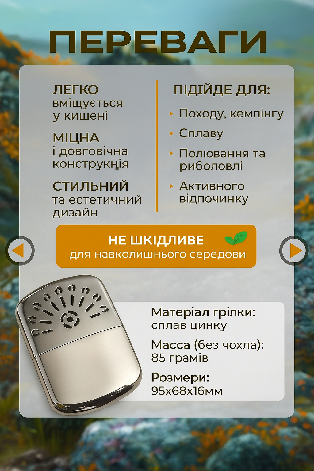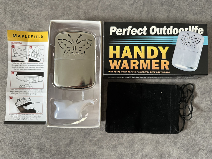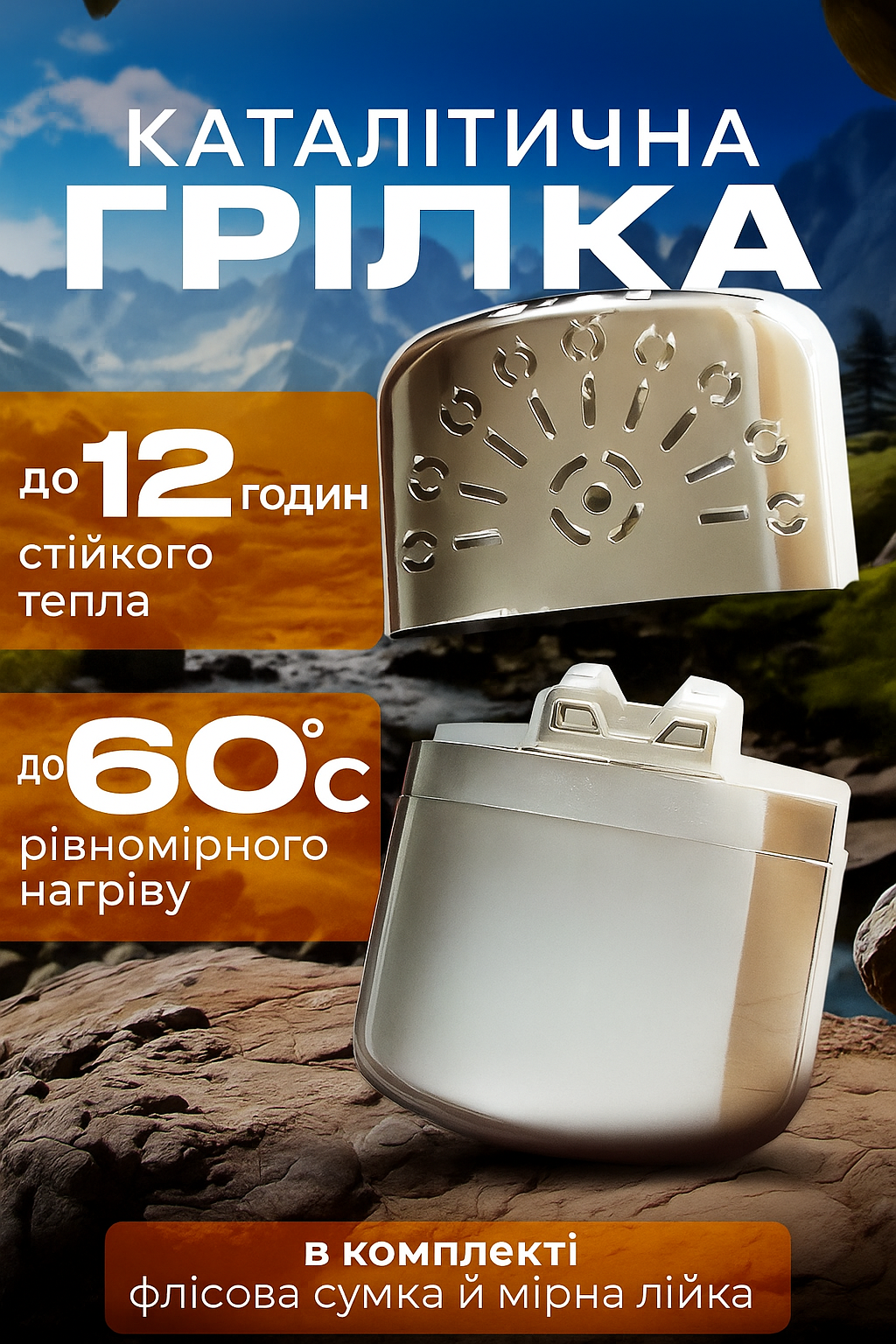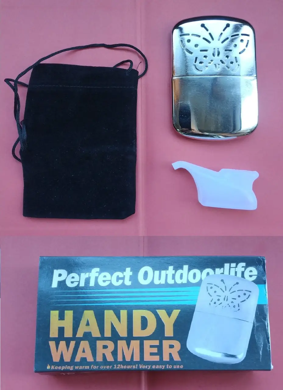 Бензинова грілка для рук Метелик, обігрівач універсальний. Кишенькова бензинова грілка. Джерелом тепла є пари бензину, що горить. Процес згоряння повністю безпечний, без запаху та бездимний. Корпус грілки з нержавіючої сталі має отвори, відповідальні за оптимальне розподілення тепла. Коротка інструкція із застосування: Знявши кришку та пальник, потрібно акуратно заповнити грілку якісним бензином. Якщо бензин потрапив на грілку, обов'язково протріть і дайте їй висохнути. За допомогою сірників або запальнички нагрійте каталізатор. Закрийте кришку і покладіть грілку в чохол. За допомогою цієї грілки можна зігріти руки чи ноги у спальному мішку. Прогрівання каталізатора треба робити звичайною запальничкою. Каталізатор використовується в середньому 8 разів, далі треба робити заміну каталізатора, який можна придбати у нас.
