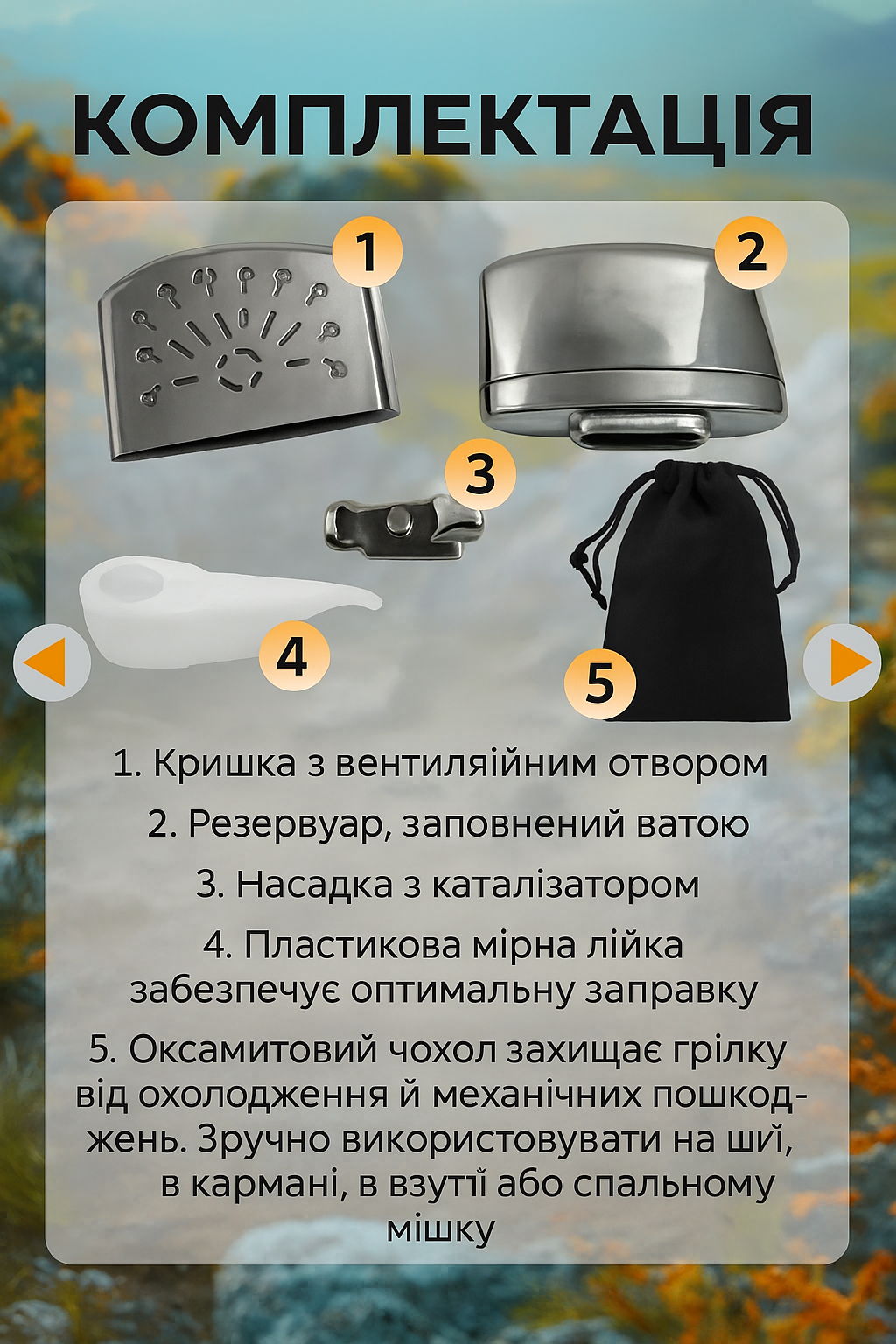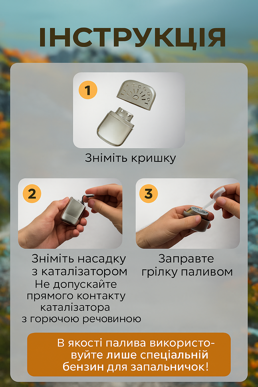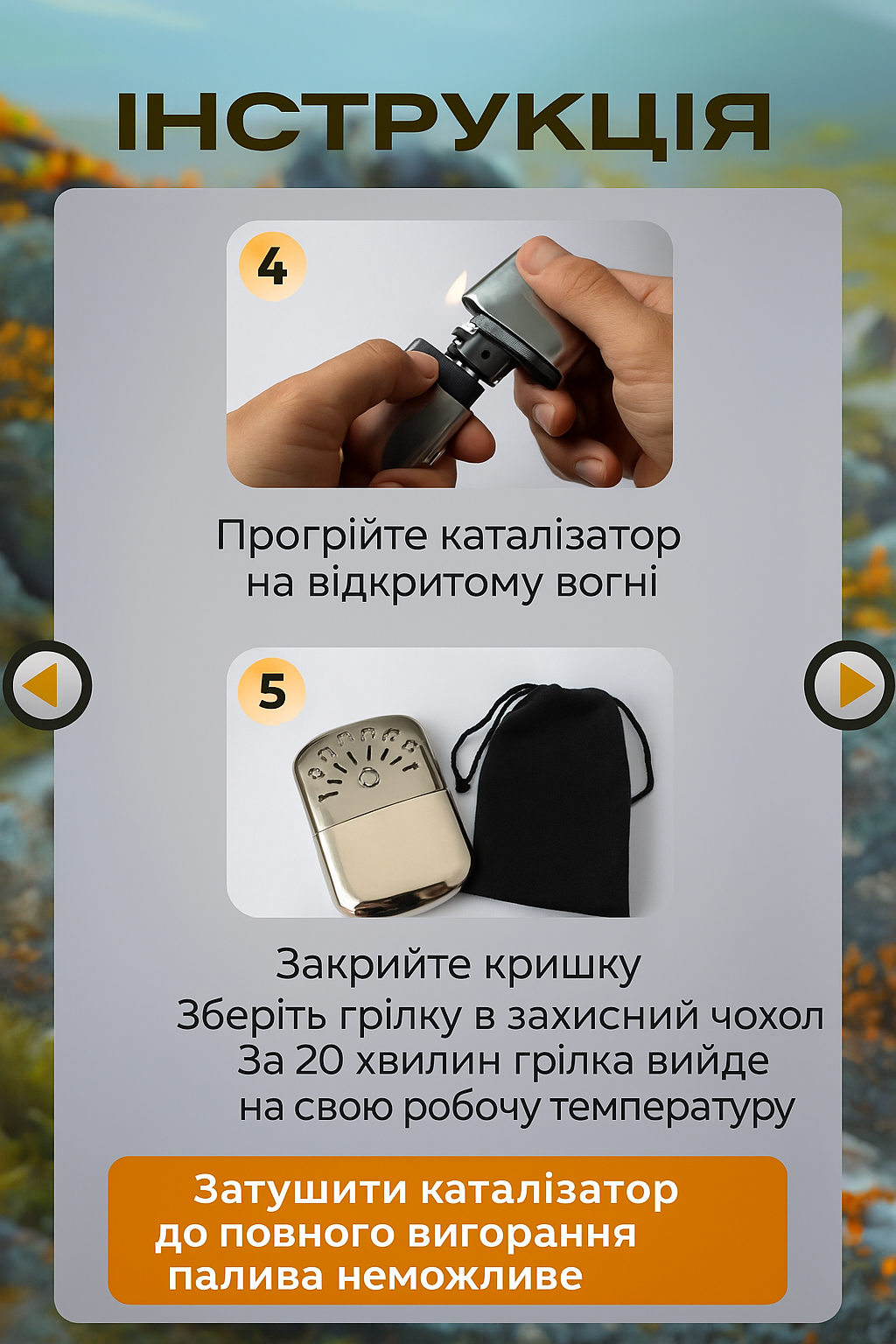 Бензинова грілка для рук Метелик, обігрівач універсальний. Кишенькова бензинова грілка. Джерелом тепла є пари бензину, що горить. Процес згоряння повністю безпечний, без запаху та бездимний. Корпус грілки з нержавіючої сталі має отвори, відповідальні за оптимальне розподілення тепла. Коротка інструкція із застосування: Знявши кришку та пальник, потрібно акуратно заповнити грілку якісним бензином. Якщо бензин потрапив на грілку, обов'язково протріть і дайте їй висохнути. За допомогою сірників або запальнички нагрійте каталізатор. Закрийте кришку і покладіть грілку в чохол. За допомогою цієї грілки можна зігріти руки чи ноги у спальному мішку. Прогрівання каталізатора треба робити звичайною запальничкою. Каталізатор використовується в середньому 8 разів, далі треба робити заміну каталізатора, який можна придбати у нас.